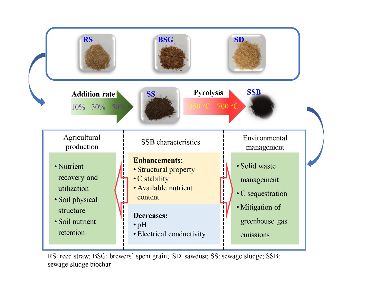 污水污泥(SS)用作生物炭生产的原料因在固体废物再利用和农业生产方面的优异性而备受关注。然而,有机添加剂(OA)添加对污泥生物炭(SSB)养分特性的影响尚不清楚。本研究将SS与芦苇秸秆(RS)、啤酒酒糟(BSG)和木屑(SD)三种OA以三种OA添加比例分别在350 ℃和700 ℃下共热解制备了一系列SSB,并对它们的基本理化性质和养分特性进行了分析。研究结果表明,OA添加显著提高了SSB的碳含量,并显著降低了SSB的产率、灰分含量、pH值、电导率以及H/C、N/C、O/C元素比。这些理化性质的变化有利于增强其土壤改良和碳汇的潜力。此外,OA共热解SSB的养分保留率和有效养分(如有效磷、钾、铵态氮和硝态氮)含量均高于纯SSB,证明其具有良好的养分回收能力和较高的养分利用效率。最终评价结果表明,当OA添加率为50%时,在700 ℃下,由SS和SD、BSG和RS共热解制得的SSB综合质量分数最高,可作为土壤施用的最佳SSB类型。该研究为OA和SS的共热解以提高SSB在农业生产和环境中的效益的应用提供重要理论支撑。