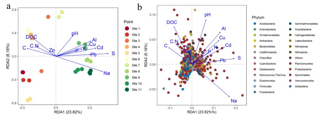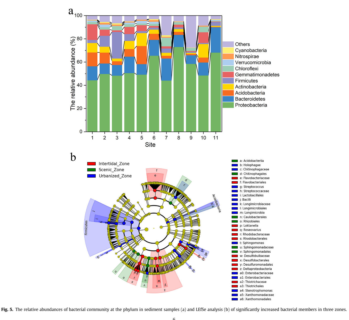 城市河流沉积物由于受到环境和人为因素的影响具有空间异质性,然而人类活动对城市河流沉积物中的微生物群落空间多样性影响作用尚不清楚。我们研究了大沽河流域青岛段沉积物中的微生物组成与重金属浓度分布特征及相互关系。结果发现大沽河沉积物中只有Cd的平均浓度明显超过了沉积物的安全限值。细菌群落的结构组成随采样点分布不同存在很大的空间差异性且根据采样区域的环境特征划分为三大聚类。其中,在近城市区Acidobacteria、 Firmicutes、 Gemmatimonadetes、 Bacteroidetes和 Gammaproteobacteria的相对丰度较高,这与人类活动有关。而在潮间带,Alphaproteobacteria和Deltaproteobacteria显著富集,这与海洋环境中的氧化还原过程有关。变异分配分析表明,变量Na、Al、总S和Zn变量对微生物的群落组成结构影响最大,其次是沉积物养分,而重金属和pH分别占总变异量的13%和9%。综上,大沽河微生物结构呈现出空间变异性和功能多样性特征,这是自然和人为因素共同作用的结果。该研究结果将有助于预测城市河流生态系统的变化规律,进而维持城市河流系统的生态平衡和健康发展。