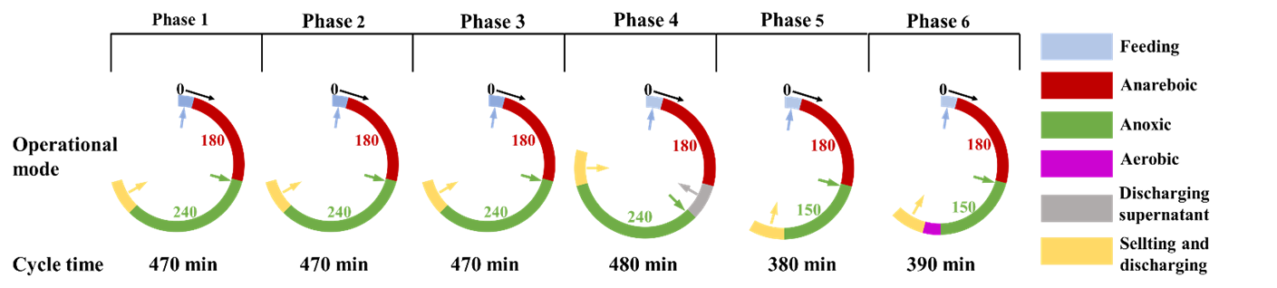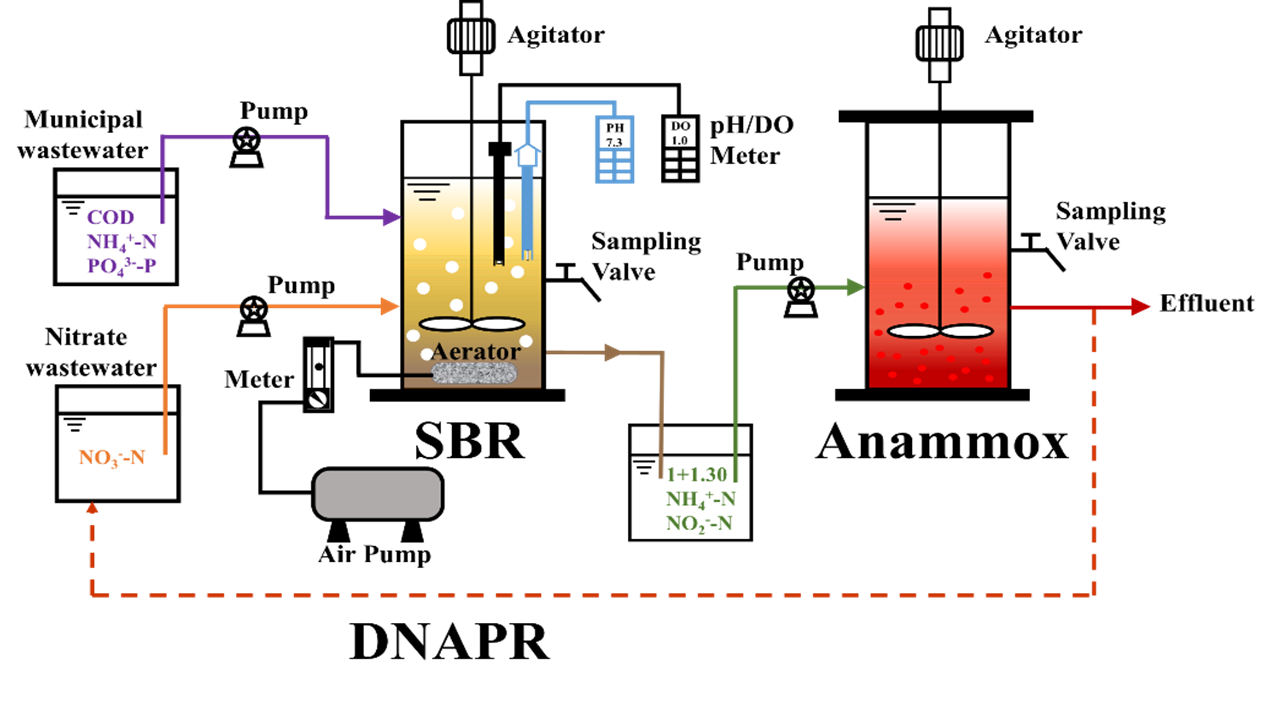 为了实现厌氧氨氧化主流工艺(Anammox),需要实现对有机物和磷的去除同时积累亚硝酸盐(NO2--N)。基于这一需求,提出了一种新型的厌氧/缺氧/好氧反应器同步积累亚硝酸盐除磷合成硝酸盐(NO3--N)。通过调整进水成分、排出厌氧末端上清液、缩短缺氧时间、增加好氧阶段,141天后,DNAPR工艺实现了硝酸盐向亚硝酸盐的转化(78.35%)和稳定的除磷效果(98.34%)。此外,出水COD为16.63 mg/L,最终亚硝酸盐为54.16 mg/L,正磷酸盐为0.37 mg/L,亚硝酸盐与氨氮的比值为1.3。微生物学分析显示,索氏菌属(34.9%)和未分类的红杆菌-植物科(6.79%)均为DNAPR的主要功能菌。因此,同步短程反硝化亚硝酸盐积累和磷酸盐去除工艺作为一种新型的预处理方法对实现主流厌氧氨氧化工艺具有重要意义。