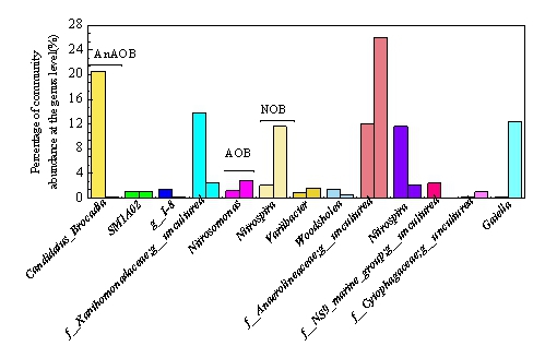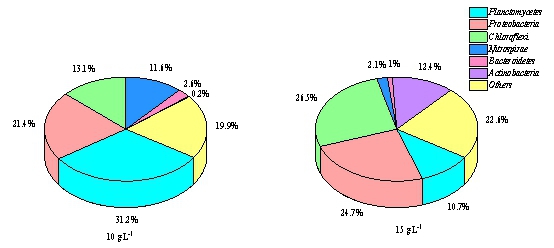 实验研究了在盐度条件下利用PEG改性PVA-SA包埋固定化颗粒运行短程硝化及厌氧氨氧化反应器的可行性。通过测定PEG改性PVA-SA包埋颗粒的有效扩散系数(De)探究颗粒的传质性能;通过添加NaCl设置盐度梯度,研究盐度驯化对包埋颗粒短程硝化及厌氧氨氧化的影响,并测定了包埋颗粒的群落结构变化。结果表明,PEG改性PVA-SA包埋颗粒对氨氮的有效扩散系数为0.313×10-9 m2/s,包埋颗粒具有较好的传质性能。分别制备硝化污泥包埋颗粒和厌氧氨氧化污泥包埋颗粒,投入反应器中。经过盐度驯化后,硝化污泥包埋颗粒可在10 g·L−1NaCl浓度下实现短程硝化,而高盐对氨氧化菌(AOB)和亚硝酸盐氧化菌(NOB)产生抑制作用。Anammox反应在10 g·L−1盐度下可得到稳定运行,且NH4+-NNO2--N的去除速率与NO3--N的生成速率比值与其理论值1:1.32:0.26十分接近。当盐度由10 g·L-1提高到15 g·L-1时,Anammox过程受到了明显的抑制,细胞代谢功能紊乱。由微生物群落结构的结果分析可得,AnAOB所属的浮霉菌门(Planctomycetes)在10 g·L-115 g·L-1盐度下分别为31.2%10.7%。在属水平下,Candidatus Brocadia丰度10 g·L-1盐度下达到20.6%。而15 g·L-1盐度下丰度小于1%,表明在10 g·L-1的盐度下可维持较好的微生物活性。这些发现将对短程硝化/厌氧氨氧化一体化(PN/A)工艺的运行提供一定的理论基础和技术支持。