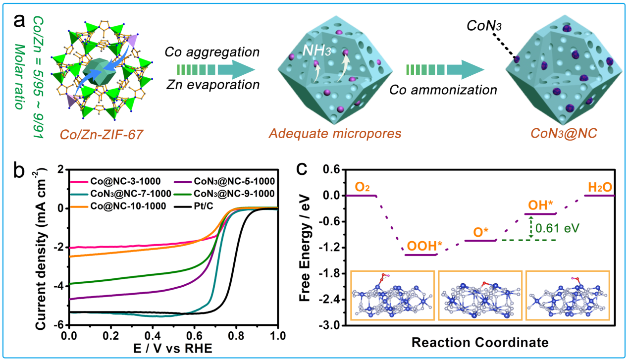 氧还原反应(ORR)由于其具有高功率密度,高效率和环保等优点,在质子交换膜燃料电池(PEMFC)中作为能量转换反应是非常有前景的,但是ORR反应的缓慢动力学限制了它的发展。到目前为止,铂(Pt)基等贵金属催化剂对ORR的催化性能在碱性电解质中非常好。不幸的是,它们在酸性介质中的ORR性能较差。然而,基于Nafion膜的商业可适性和在空气CO2中的稳定性,酸性PEMFC比碱性PEMFC更有前景。因此,对于在酸性电解质中具有显著ORR活性的非贵金属催化剂的研究显得格外重要。之前的研究表明,过渡金属与N掺杂碳材料之间形成金属-N键对于实现酸性ORR性能至关重要。最近,相关理论研究表明,在酸性介质中,将CoN3活性位点嵌入碳基体中的复合材料,是一种非常有前景的ORR电催化剂,与之前所报道的CoN4相比,其动力学更有利于四电子反应过程。但是,CoN3催化剂由于其较高的能垒需要苛刻的合成条件,至今尚未成功合成。基于此,来守娟硕士探索了以ZIF-67为前驱体,通过调控Zn/Co比例成功合成CoN3化合物。通过实验测试证明了该化合物在酸性电解质中,具有积极的半波电位(0.72 V vs. RHE)和高的电流密度(5.40 mA cm-2),表现出了优异的ORR性能。