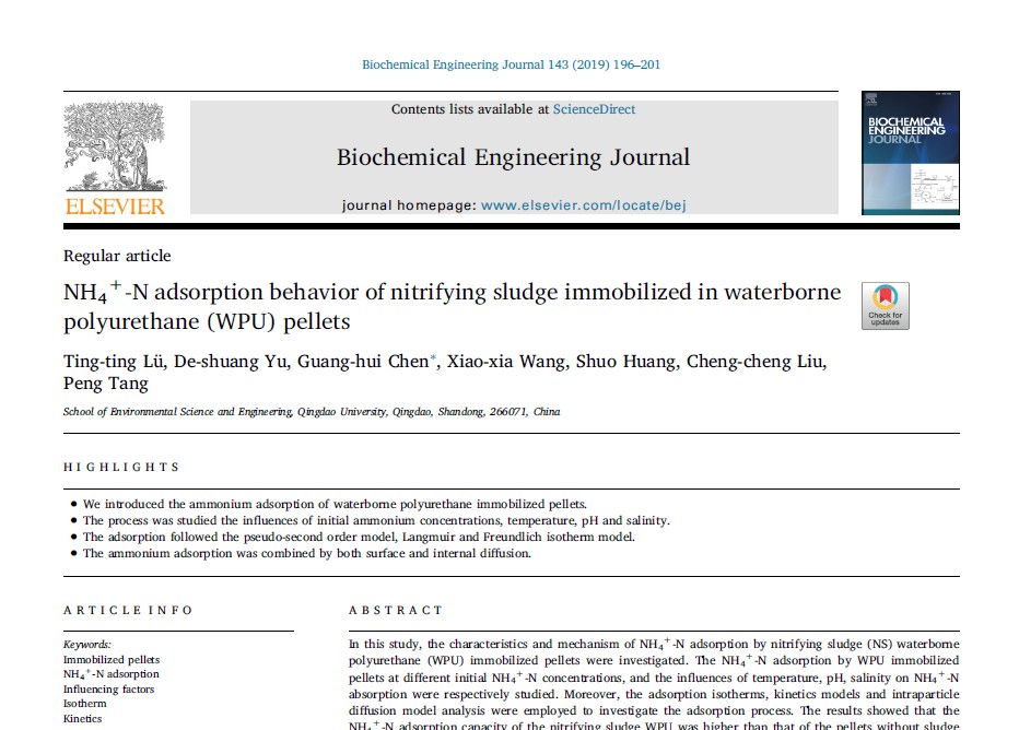 硕士研究生吕廷廷在包埋菌颗粒氨氮吸附方面的研究取得了重要进展。相关成果以“Ammonium adsorption behavior of nitrifying sludge waterborne polyurethane (WPU) immobilized pellets”为题发表在期刊Biochemical Engineering Journal上,该期刊影响因子为3.226。我校为第一作者单位,吕廷廷为第一作者,我校于德爽教授和陈光辉老师为通讯联系人。该研究得到了国家自然科学基金、山东省自然科学基金、中国博士后科学基金和北京市博士后科学基金的资助。