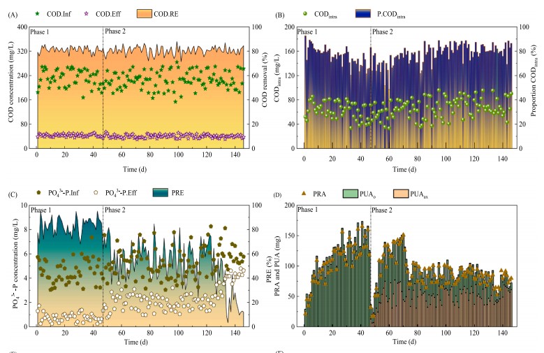 本研究通过接种硝化悬浮污泥,在一体化固定生物膜活性污泥(IFAS)反应器中快速建立反硝化除磷系统来处理低C/N城市污水。结果表明,运行方式由厌氧/好氧(A/O)改为厌氧/缺氧/好氧(A/A/O)后,磷去除率(PRE)维持在55.65%。虽然污泥浓度(MLSS)下降到60 mg/L以下,但PRE在第33天内仍高于54.01%。然而,在没有AS排泥的情况下,PRE逐渐降低,导致DPR性能恶化。原位批次试验表明,磷吸收主要发生在缺氧阶段。然而,聚糖菌(GAOs)的存在可能导致PO43-/NO3-比值较低。后期的好氧吸磷确保了较低的出水PO43--P浓度,但不可避免伴随着NH4+-N氧化。在生物膜形成过程中,GAOs(Candidatus_Competibacter)对胞外聚合物(EPS)的分泌更活跃,在生物膜中占主导地位(22.35%)。A/A/O运行100天后,PAOs的优势属为Pseudomonas(1.27%)和Thiothrix(2.24%)。此外,为了避免生物膜DPR的劣化,研究讨论了潜在的风险和相应的对策,可为基于生物膜的DPR有望与厌氧氨氧化相结合,实现高效的养分去除和低碳需求提供理论基础。