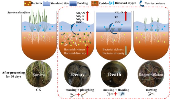 入侵物种互花米草现已广泛分布于我国沿海地区,不断侵占本土植物的生存空间并对滨海湿地生态环境造成严重威胁。课题组在实验室环境下模拟了互花米草的三种常见物理控制手段:“刈割+淹水(MF)”、“刈割+翻耕(MP)”和“刈割(M)处理”,并探究了其对于滨海湿地生态环境的影响。结果表明:(1)在为期60天的实验中,MF和MP处理完全根除了互花米草;然而,淹水和翻耕处理以及互花米草的腐烂会改变沉积物的生物地球化学特征,导致内源营养物质的异常释放;(2)Spearman相关分析和水质结果表明,MF处理中NH4+-N(1.80 mg/L)和TP(0.43 mg/L)的平均浓度,以及MP处理中NH4+-N(1.49 mg/L)、NO3--N(0.95 mg/L)和NO2--N(0.35 mg/L)的平均浓度因养分的迁移转化而大大增加;(3)平行因子分析(PARAFAC)证实,溶解性有机物(DOM)的三种成分及其在上覆水中的上升与互花米草的分解和沉积物扰动有关,可能会增加近海水体富营养化的风险;(4)三种物理控制处理通过改变特定细菌的定殖和沉积物微环境来改变细菌群落的结构和组成;Mantel检验分析和结构方程模型(SEM)表明,MF和MP处理中关键营养元素的变化对细菌群落结构有显著影响。本研究揭示了互花米草治理过程中营养物质的迁移和转化机制,以及细菌群落结构在物理控制过程中的响应,研究结果为推进湿地一体化保护和修复格局与功能的整合优化提供参考,对滨海湿地生态系统整体效益的提升具有重要意义。