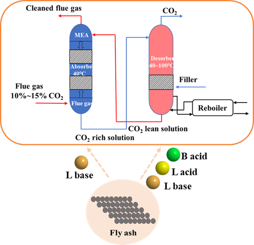 大气中二氧化碳(CO2)等温室气体浓度逐年增加,导致全球变暖。燃煤发电是最大的二氧化碳排放源之一,工业上应用主要以水相有机胺吸收法最为普遍,再生能耗高是限制其发展的关键因素。因此,本研究利用三种不同组成的粉煤灰(1-FA、2-FA和3-FA)作为催化剂,对其在整个MEA-CO2吸收−解吸过程中提供的协同效益进行了评估。结果表明,1-FA的催化性能最好,与空白对照相比,其CO2循环吸附容量提高了6.7−26.1%,CO2解吸率最高提升了96.0%,显热降低了24−28%。原因是粉煤灰中既有酸性物质(硅铝酸盐)又有碱性物质(CaO、MgO),其表面存在Brønsted酸位、Lewis酸位和Lewis碱位,能够作为质子供体和电子受体,固体酸和固体碱催化剂同时起作用。该研究结果表明,粉煤灰具有零成本、高利用率的特点,可以作为一种较好的CO2吸收和解吸复合催化剂。