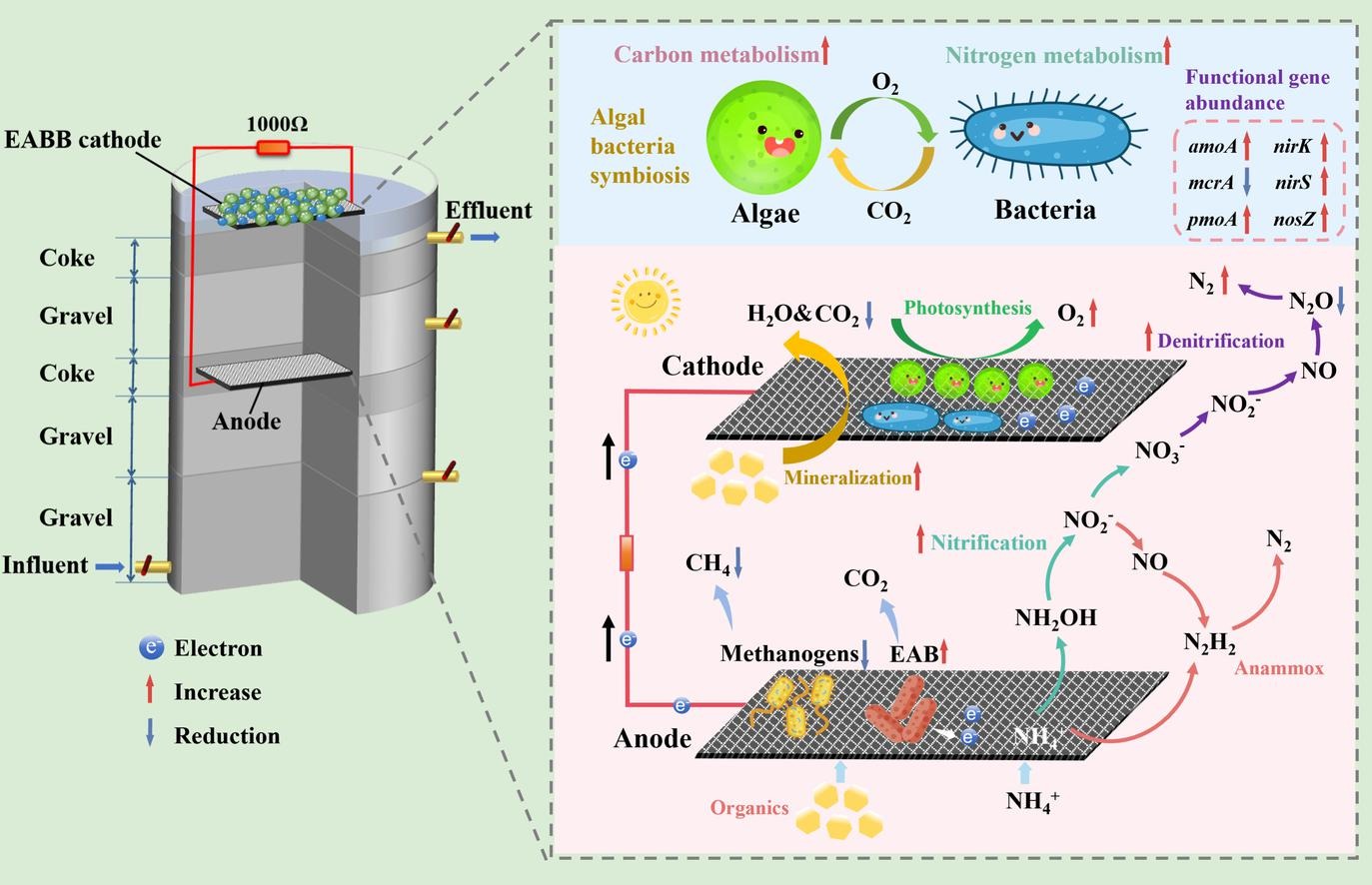 人工湿地(Constructed Wetlands,CW)作为一种生态友好的清洁技术,在环境治理中得到了广泛的应用。然而,污染物去除效率的限制和温室气体的排放是CW应用的主要问题。该研究在微生物燃料电池(Microbial Fuel Cell,MFC)中引入电活性藻菌生物膜(Electroactive algal-bacterial biofilm,EABB)阴极,构建强化型电活性CW(EABB-MFC-CW)系统,增强其减污降碳性能。研究发现:(1)EABB-MFC-CW系统在污染物去除方面表现出更高的处理效率,对COD、NH₄⁺-N和TP的去除率分别达到83.9%、78.7%和77.2%;(2)EABB-MFC-CW系统显著降低了温室气体排放,全球变暖潜能值(GWP)较传统MFC-CW减少58.63%;(3)EABB的引入优化了MFC-CW系统的电化学性能,系统的平均输出电压提升至271.33±75.71 mV,较MFC-CW系统(155.72±29.90 mV)显著提高。最大功率密度达到159.88 mW/m³,库伦效率提升至4.24%。添加EABB阴极促进了系统中的微生物胞外电子传递(EET),提高了电子转移效率,增强了系统的产电性能;(4)宏基因组测序结果表明,添加EABB阴极显著提高了系统微生物的丰富度和多样性(如产电菌Geobacter和Desulfuromonas),提高了关键功能基因的丰度。EABB-MFC-CW通过调节pta、mcrA和pmoA的丰度来促进碳代谢,通过影响amoA、nirK和norZ基因和电子传递促进氮代谢。综上,该研究开发的EABB-MFC-CW系统能够有效提升污染物去除效率,降低温室气体排放,为污水处理中的碳污协同控制提供了环保、高效的新策略。