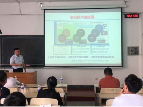李朝升教授将课程思政元素融入专业报告,从国家战略目标、发展氢能源的意义、氢能源的应用场景及现在面临的问题等深入浅出介绍了太阳能分解(海)水制氢的研究现状。重点介绍了团队利用太阳能分解(海)水制氢的最新研究进展,包括构造图灵结构光阳极提升电荷分离效率、增加亚稳相光催化剂热稳定性和提高光电催化分解海水制氢活性策略、高效分解海水制氢的新型电催化剂的制备等。会上,他还耐心解答了师生提出的问题,现场学术氛围浓厚。