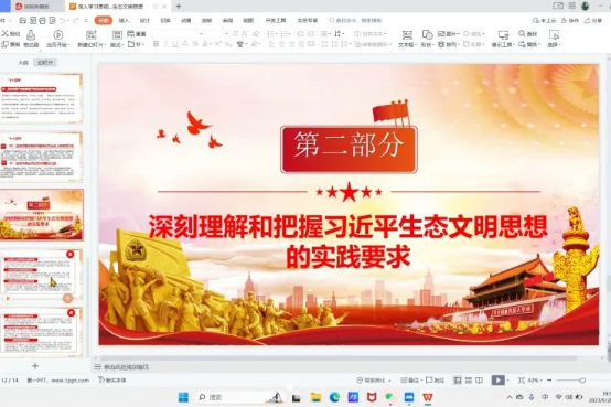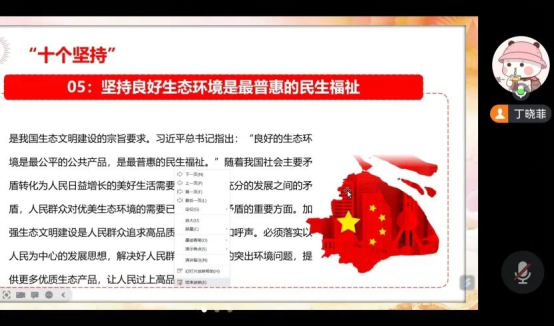 然后丁晓菲同学就如何推动生态文明建设的实践要求从六个方面展开了叙述:努力建设人与自然和谐共生的美丽中国、坚决扛起生态文明建设的政治责任、加快推动经济社会发展全面绿色转型、为人民群众提供更多优质生态产品、推进生态环境治理体系和治理能力现代化、推动共建清洁美丽世界。