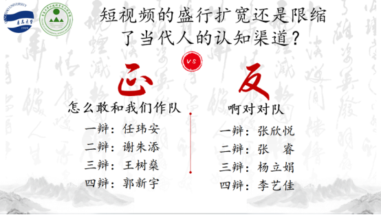 上半场比赛,由答辩主席付炀介绍了辩题。在当今科技与大数据时代,内容丰富、形式多样、规模极小的短视频,成为越来越多人的选择。而短视频的盛行究竟是扩宽还是限缩了当代人的认知渠道?让我们跟随正方“怎么敢和我们作队”和反方“啊对对队”的辩手们来一探究竟吧!