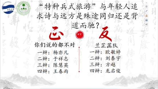 紧接着,我们迎来了下半场比赛,下半场比赛由答辩主席张欣悦主持,网络上盛行了一波“特种兵式旅游”,不是在目的地就是在去目的地的路上,挑战的就是体力和时间的极限。然而自由没有方向,山河湖海皆是归途,诗和远方也并不遥远。那年轻人进行“特种兵式旅游”与追求诗和远方是殊途同归还是背道而驰呢?辩论双方都有自己的看法,让我们看看正方“你们说的都不对队”和反方“兰芷菡队”的精彩表现。
