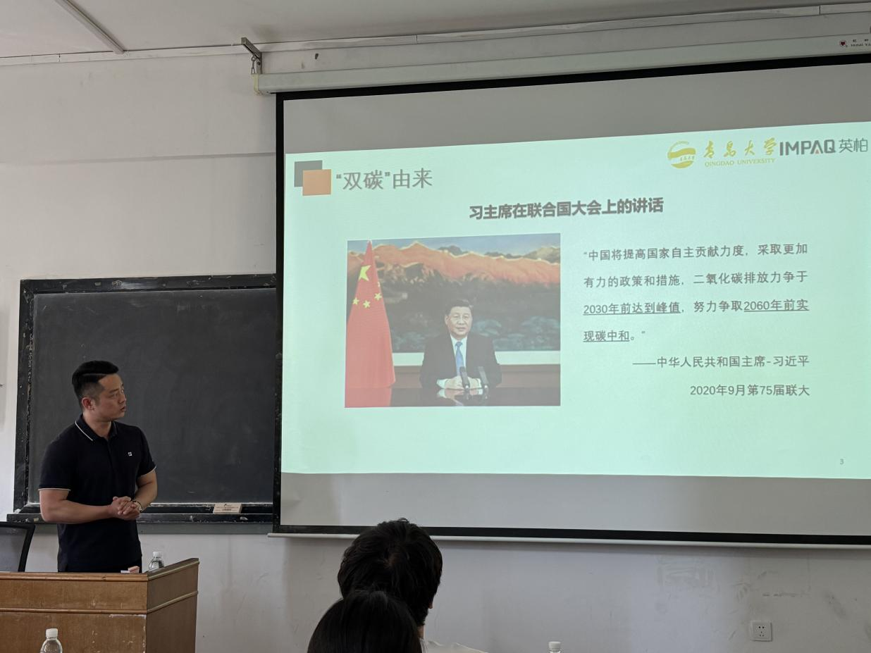 院长佘希林教授主持。亓树增校友是青岛大学2008届毕业生,同时担任中华环保联合会绿色贸易促进委员会副秘书长,在“双碳”领域经验丰富、贡献颇丰。他满怀热忱回到母校,期望以自身经验为学弟学妹的职业发展指明方向。