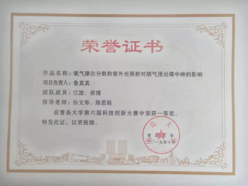 在刚刚结束的青岛大学第六届青岛大学科技创新大赛中,网上赌博平台 师生获得优异成绩。由孙文寿和陈思铭老师指导、鲁真真、江波和侯博三位同学具体负责的“氧气摩尔分数和紫外光照射对烟气浸出煤中砷的影响”项目获得一等奖;董健、严颖、翟凌阁、江沛玉和张舜等同学具体负责的项目获得了二等奖;张雨同学具体负责的项目获得了三等奖。同时,孙文寿和陈思铭两位老师也荣获了“第六届青岛大学科技创新大赛金牌指导教师”的荣誉称号。