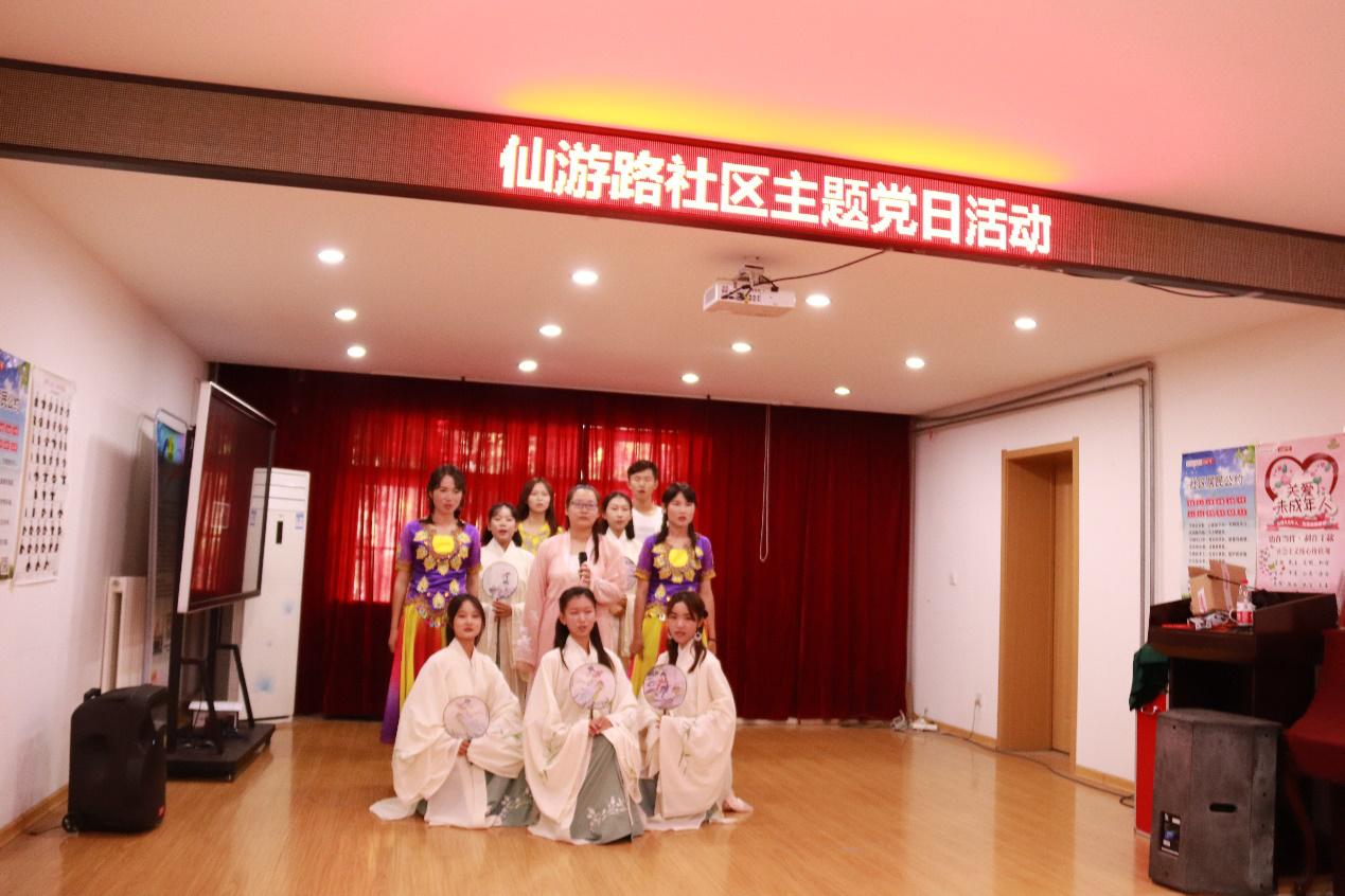 2018级刘欣易和张雯淇同学带来激情洋溢的爵士舞,来自新疆的2019级布比帕提马·阿依提和米热班·坎木都拉两位同学表演了一段别具风情的民族舞蹈,最后,2018、2019级的张嘉乐、朱小轩等七位同学登台表演的温柔婀娜的歌伴舞。优美的歌声和轻快的舞步,为社区居民带来的一阵阵欢声笑语,为仙游路社区增添了一份喜庆的气氛。
