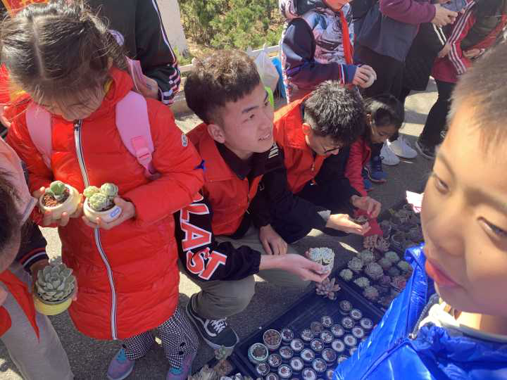 “知行”青年实践服务团联合青岛市基隆路小学和青岛市镇江路小学的志愿者和孩子以及新阳光心理研究所在我校浮山校区东院举办了“关爱来自星星的孩子——走进自闭症儿童”多肉植物爱心义卖活动。