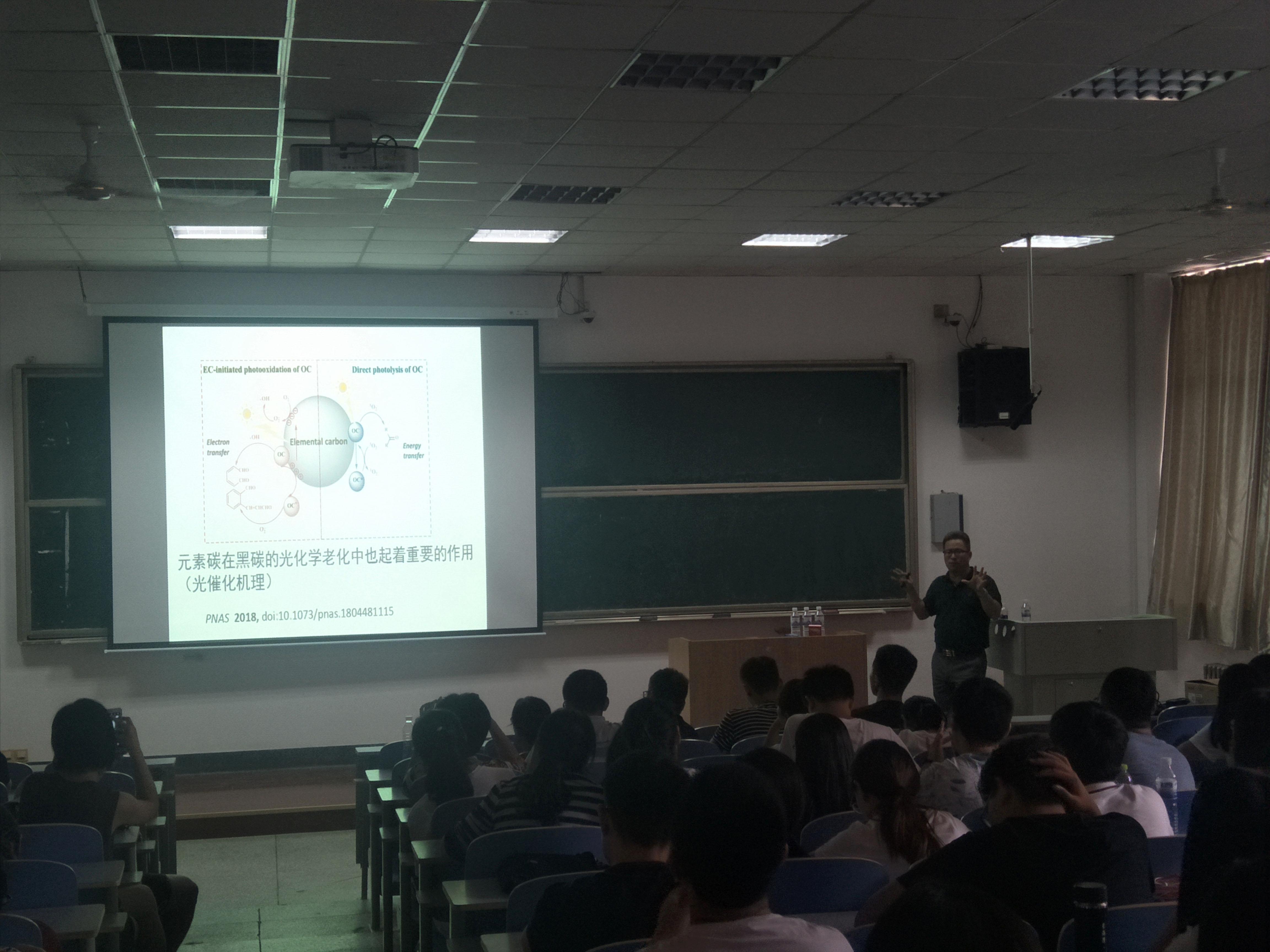 陈春城以光催化去除有机污染物为切入点,为大家深入浅出地介绍了有机污染物光催化降解过程中的界面反应机理,重点介绍了从O18同位素标记技术对光催化分子氧活化机理和作用的研究;动力学同位素效应在研究光催化剂表面质子耦合电子转移机理中的应用;原位红外揭示氧气参与的光催化脱羧反应路径以及关于元素碳在黑碳光化学老化过程中的关键作用的最新进展。报告内容翔实,现场学术氛围浓厚。师生们仔细聆听,踊跃提问,认真笔记,对光催化技术在环境中的应用有了深入的了解和思考。
