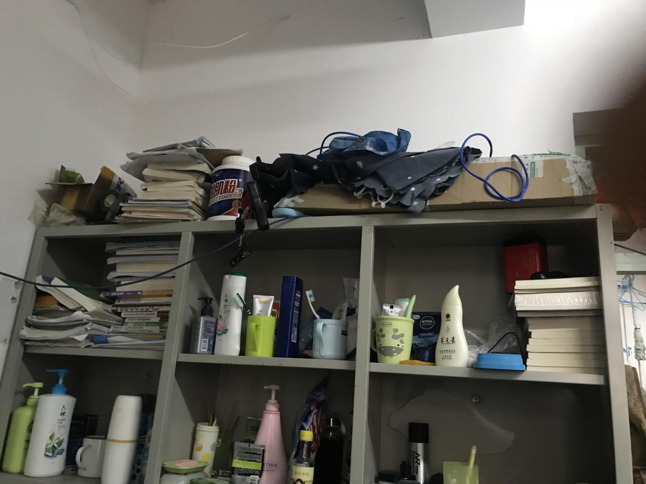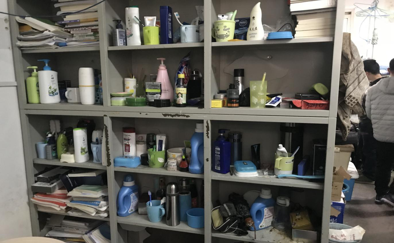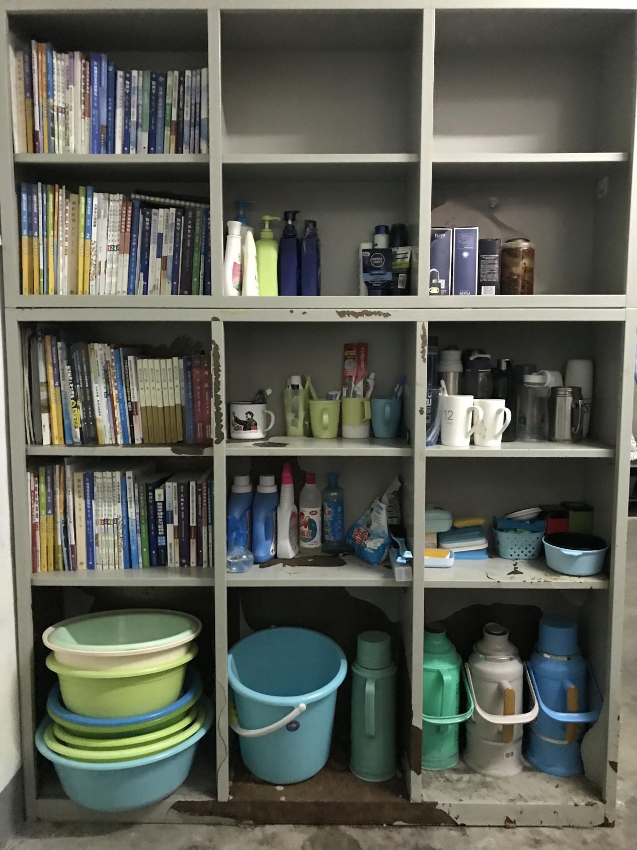 瓶瓶罐罐摆在一起,每个人分的小柜子里,塞满自己的日用品,有几个柜子堆满了不用的旧书和试卷.....