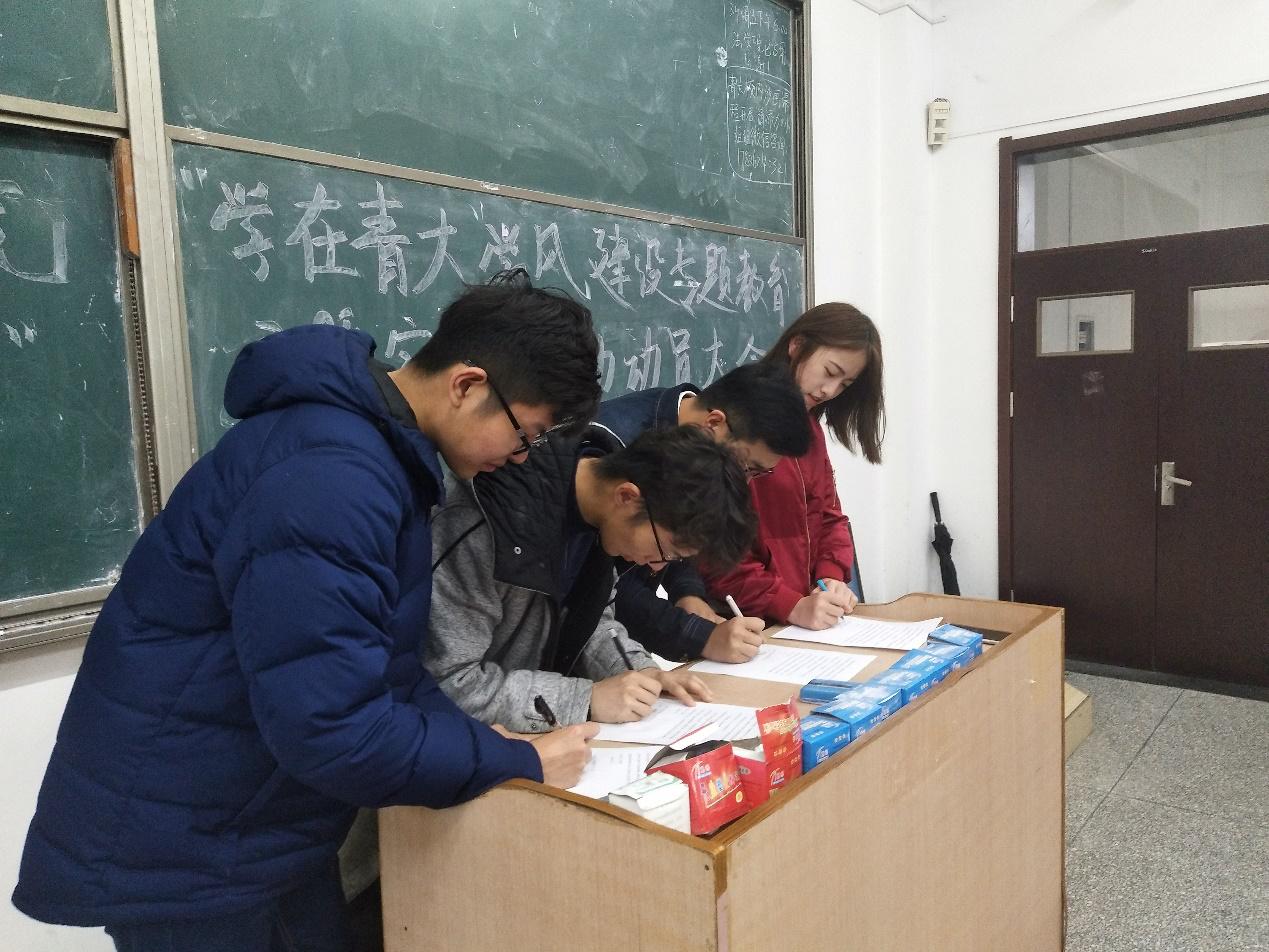 学生会主席黄宇诺同学向全院学生发出了“学在青大”学风建设专题教育暨“文明青大·美丽家园”主题实践活动六点倡议,各班班长带头在倡议书上郑重签字承诺。最后,网络赌博
