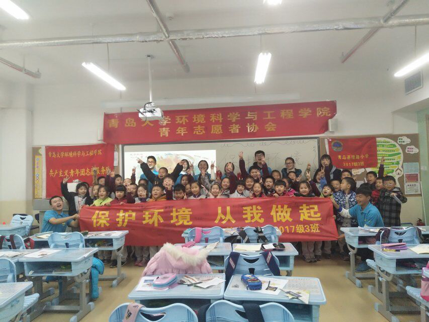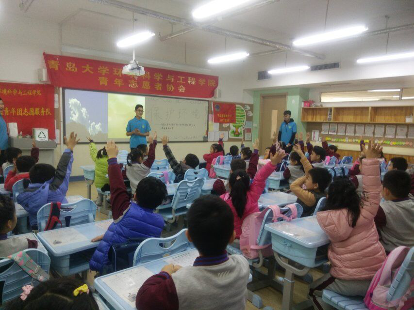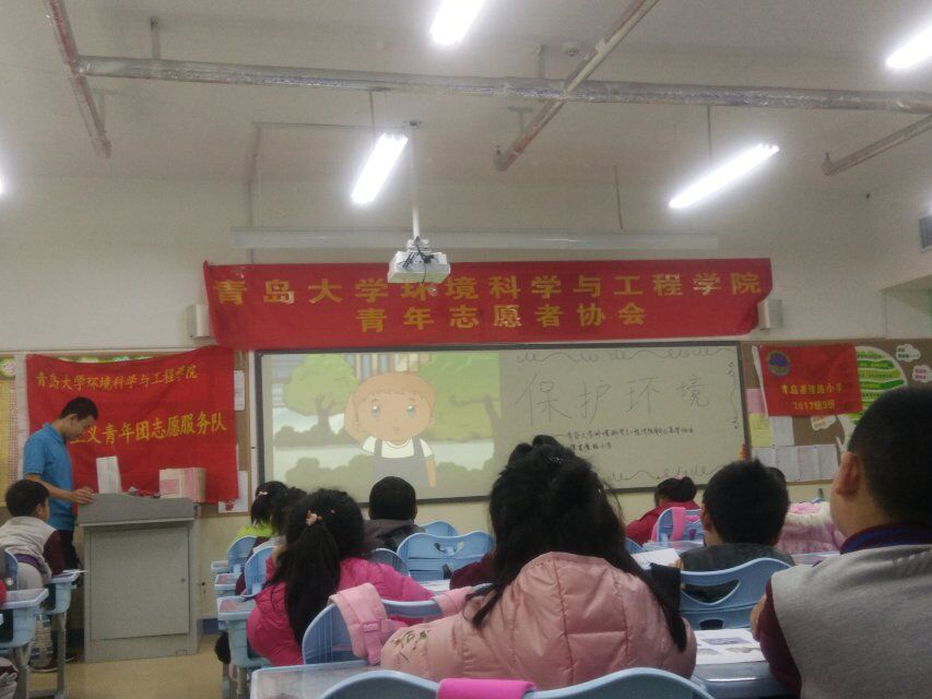 11月27日下午,网上赌博平台 青年志愿者协会的同学们来到基隆路小学2017级三班开展支教活动,志愿者通过PPT讲解和相关动画片播放等形式来宣传国家的绿色环保理念和知识,还开展了废物利用方面的互动游戏,最后和小学生们一起集体宣读了“珍视天空,关爱大地”倡议书并在“保护环境,从我做起”的横幅上签名。