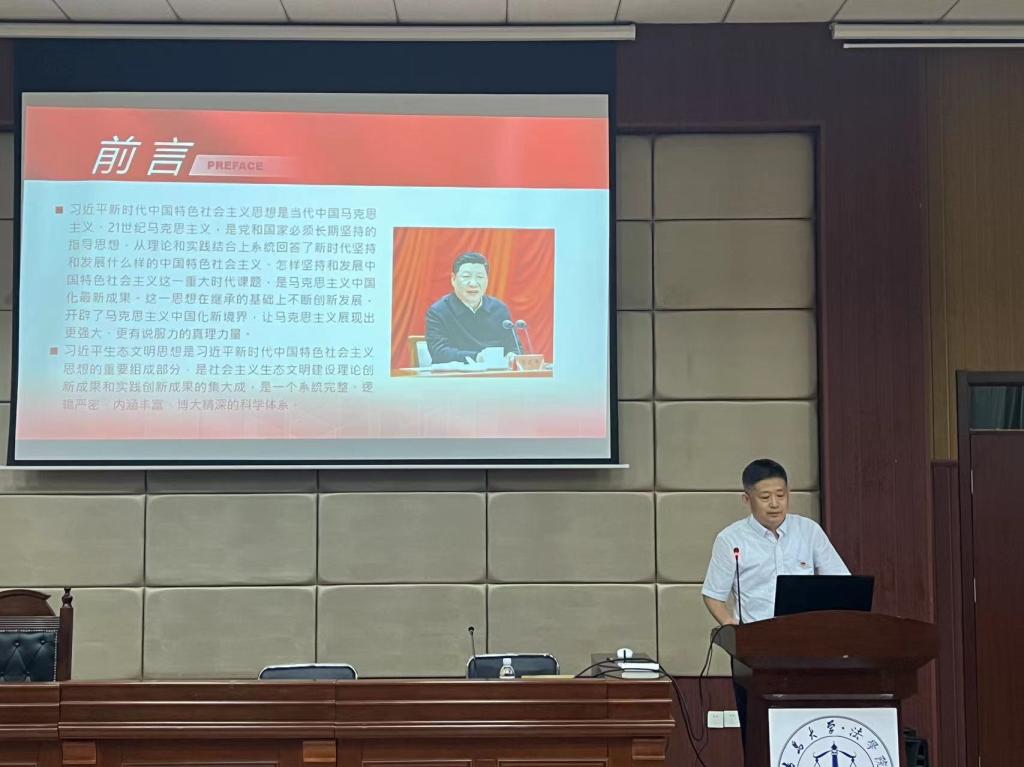 在浮山校区笃行楼模拟法庭举办“深入学习贯彻习近平生态文明思想,努力开创新时代美丽中国建设新局面”主题教育专题党课,院党委书记张作祥为全院党员干部师生100多人讲授党课。