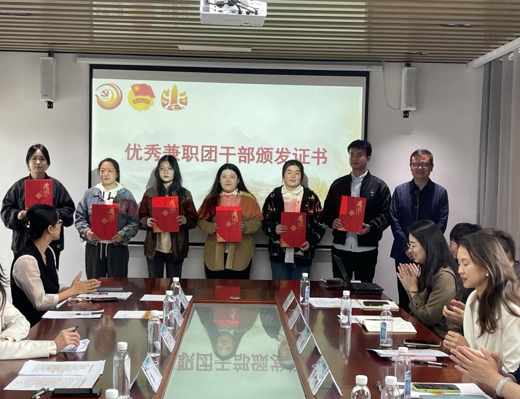 李涛、孙竹媛、青岛世家百草生物科技有限公司负责人辛学诗共同为大学生实践育人基地揭牌,并为优秀兼职团干部颁发了证书。