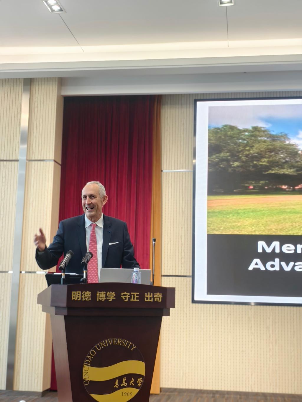 副校长李荣贵出席报告会并致辞。李荣贵在致辞中代表青岛大学对Pedro J. Alvarez教授表示热烈欢迎,他简要介绍了学校事业发展成就和我校生态环境学科的建设情况,希望通过强化国际合作和交流,推动生态环境领域的创新发展。