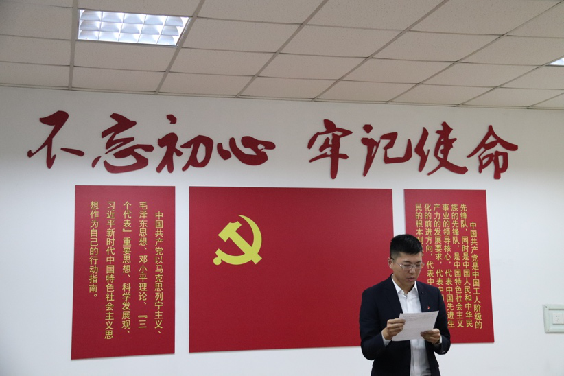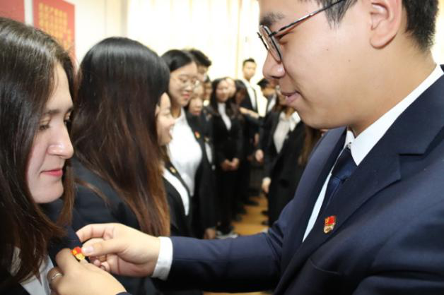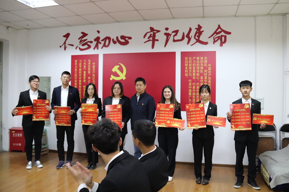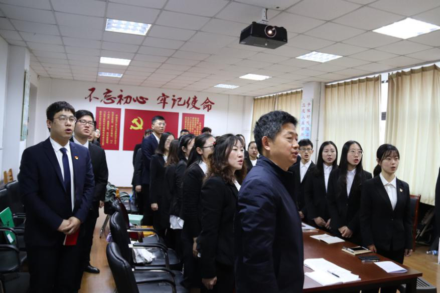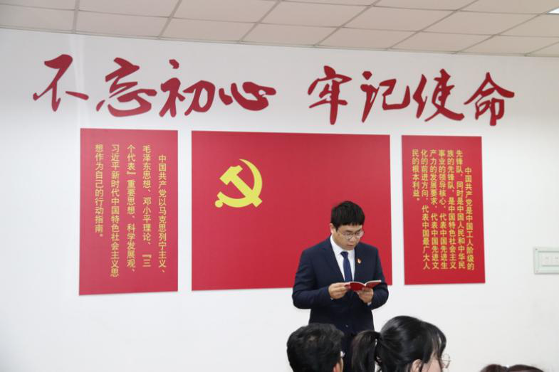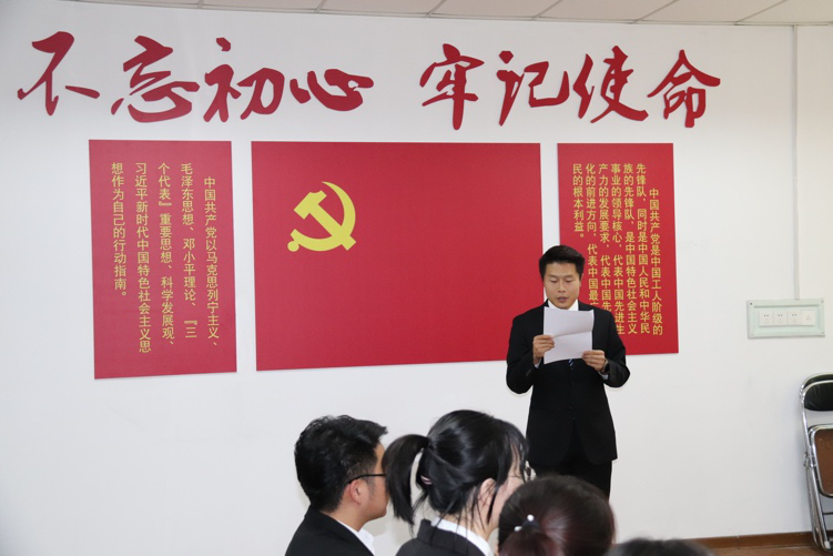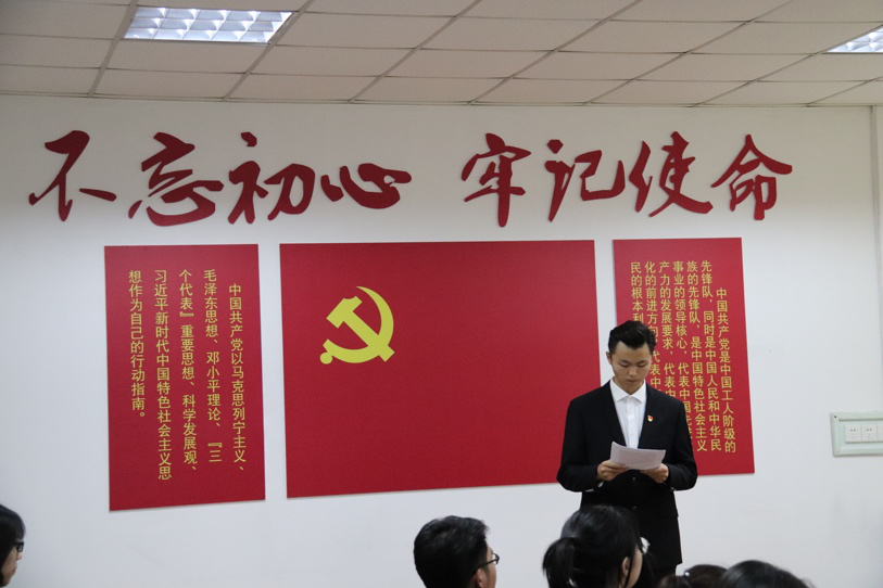 本次主题党日活动由刘妍妍主持,在全体党员起立奏唱国歌声中开始。首先,老党员为新党员佩戴党徽院学生会主席吴至宸和副主席王超两位同学代表党员分别结合各自的家庭背景、求学经历,讲述了自己的心路成长历程,分享了自己对党的认识和感情逐步加深的过程。优秀党员代表研究生国家奖学金获得者、2017级研究生唐鹏同学,希望同学们牢记共产党员的初心和使命,既要树立远大的理想,又要脚踏实地,既要勤于学习,又要善于思考,把自己努力培养成为德智体美劳全面发展的社会主义建设者和接班人。三位党员学生的发言,言辞恳切,贴近实际,为同学们树立了良好的学习榜样。