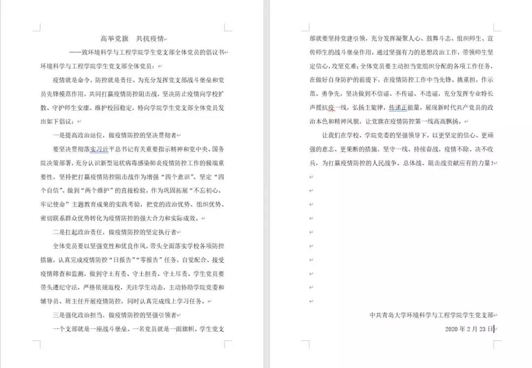 学生党支部副书记王会萃老师全文传达了《习近平总书记在中央政治局常委会会议研究应对新型冠状病毒肺炎疫情工作时的讲话》和《青岛大学关于进一步发挥全校基层党组织和党员干部作用坚决打赢防控阻击战的通知》精神。学生党员吴至宸代表党支部宣读了《高举党旗,共抗疫情》倡议书,号召全院学生党员要将抗击疫情作为巩固拓展“不忘初心、牢记使命”主题教育成果的实践考验,以更坚定的信心、更顽强的意志、更果断的措施,坚守岗位,勤奋学习,努力工作,为打赢疫情防控的人民战争、总体战、阻击战贡献应有的力量!郝梓然、王琪程、张乃弛三名学生党员分享了各自在当地疫情防控的一线主动承担起志愿服务工作的心得体会。刘妍妍提出六点要求:第一,做好自我防护的同时积极的参加各地的志愿服务工作。第二,配合辅导员老师做好各年级的平安日报、集结号等上报统计工作,做到积极带头,准时不拖沓。第三,严格落实国家学校的各项规定要求,不提前返校。第四,要做文明青大信息督导员,不传谣,不信谣,弘扬主旋律,传递正能量。第五,在家里多学习,通过学习强国等平台多了解国家政策内容。第六,毕业生党员带头以积极的心态面对考研复试和就业,带动起周围的同学,协助老师做好毕业生的各项工作。
