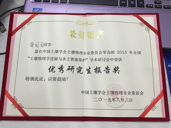 2015年8月1日至3日,由中国土壤学会土壤物理专业委员会主办,青岛大学承办的2015年全国“土壤物理学进展与水土资源保护”学术研讨会在我校成功举办。湿地生态与环境课题组老师和研究生们积极参加了会议,同时承担了部分会场服务工作。其中,訾园园同学做的“胶州湾滨海湿地土壤有机碳时空分布及储量”报告获“优秀研究生报告奖”。
