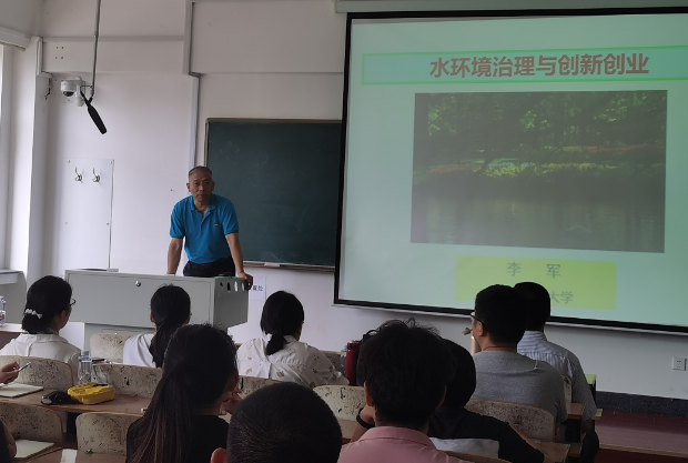李军教授首先对北京工业大学城市建设学部水处理研究方向及团队做了介绍。接下来,他认为随着对绿水青山就是金山银山认识的提高,越来越多学生选择环境类专业,同时也有越来越多环保类公司建立,当大学生毕业时将面临更多的机会与挑战,如何将环境污染治理与创新创业结合是一个重要课题。最后,他系统介绍了针对污染物处理技术商业化、创新创业指导方面的问题。报告结束后,他与现场师生进行了互动交流,解答了关于创新创业、污水处理技术等方面的问题。